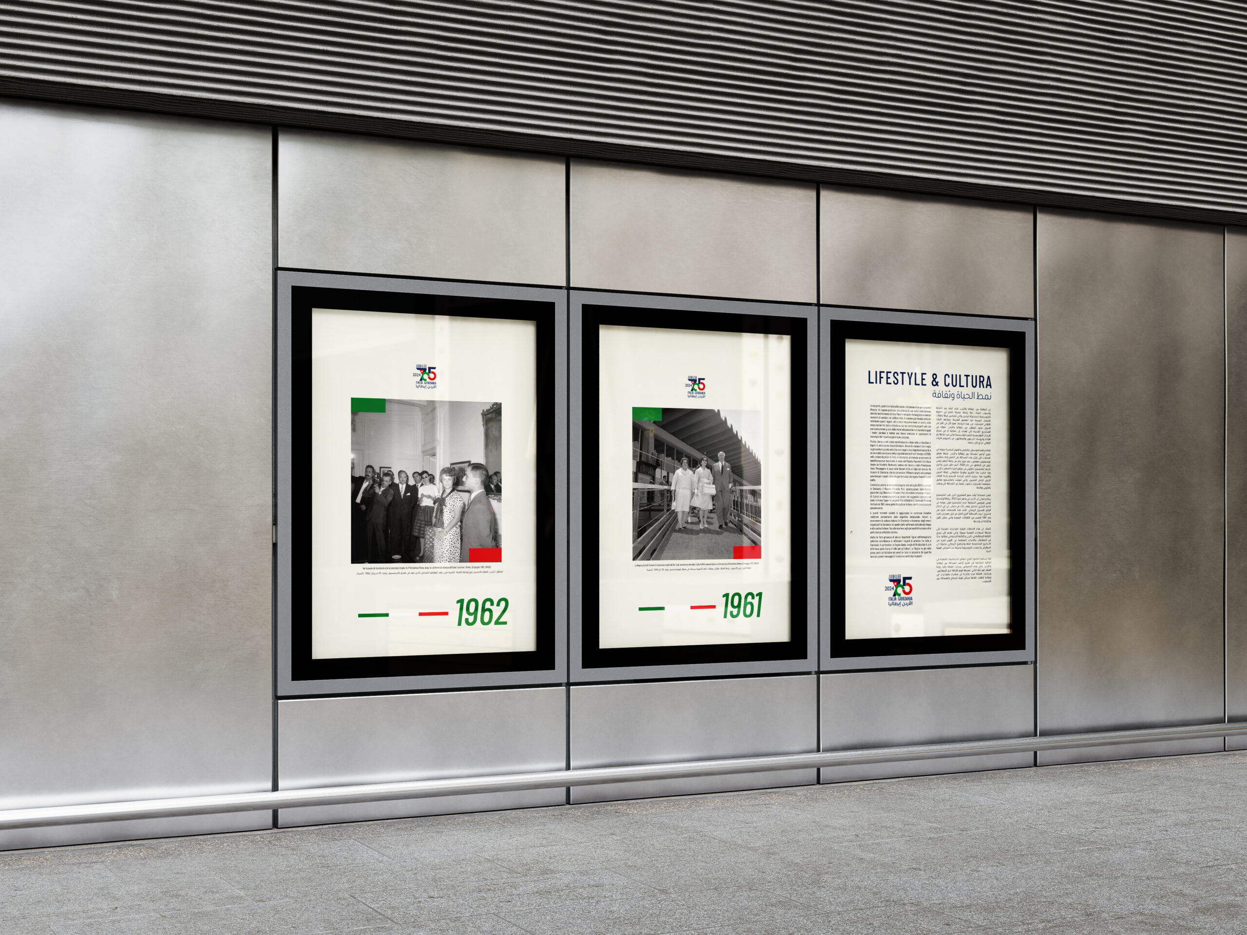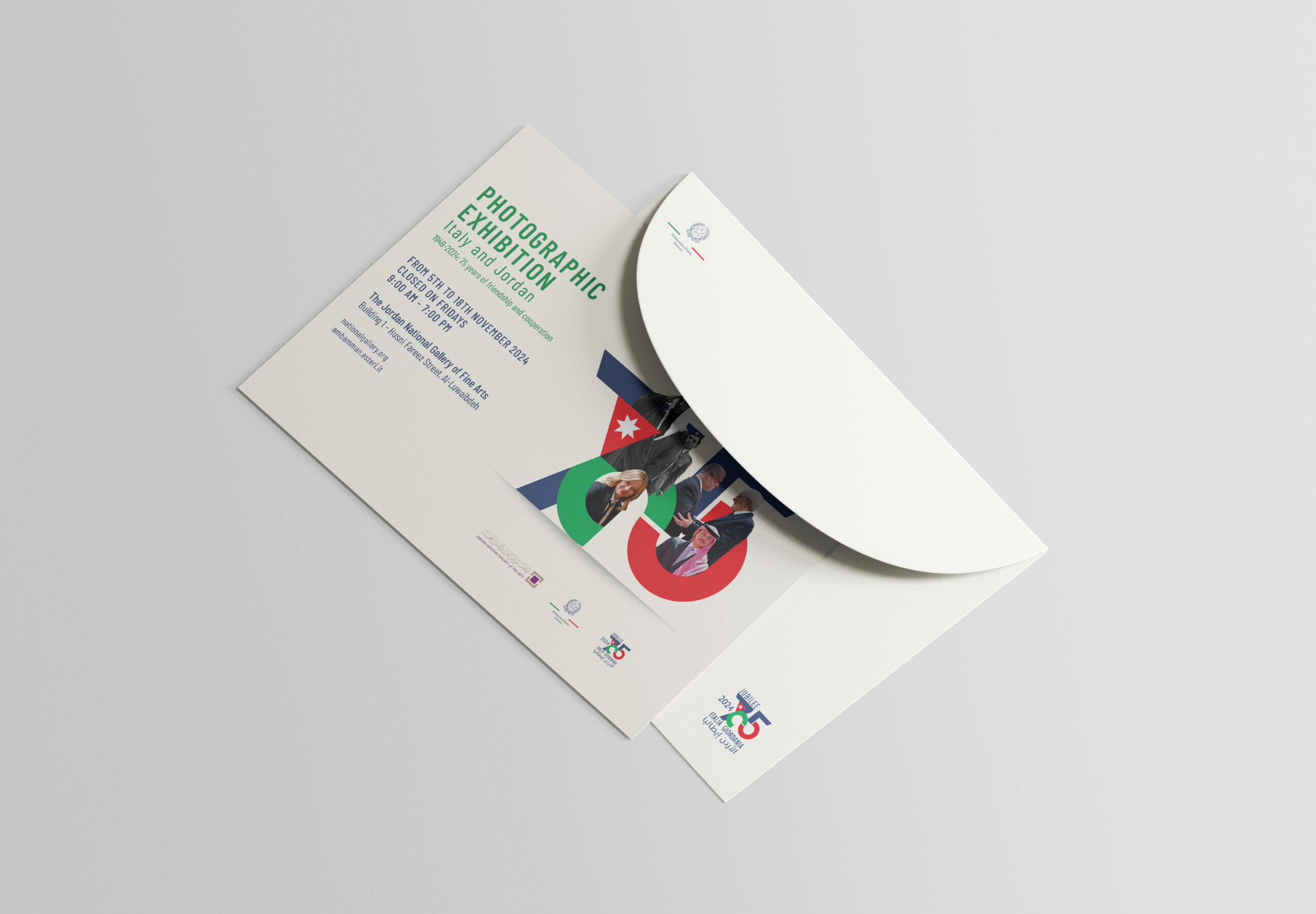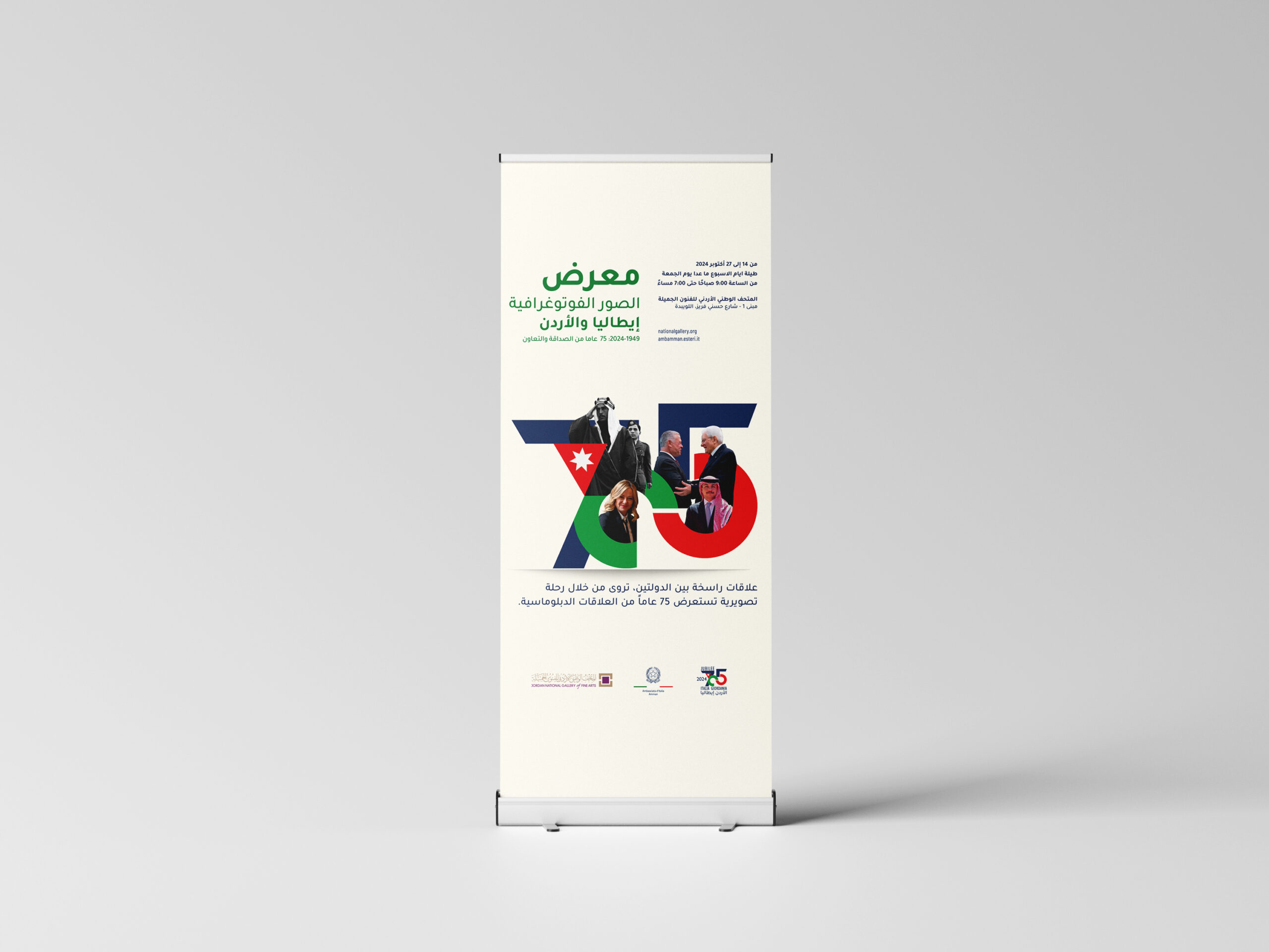 The exhibition was organized by the Italian Embassy in Amman in collaboration with the Jordan National Gallery of Fine Arts. I curated the visual, graphic, and textual design of the exhibition, developing the panels, typographic layout, and overall visual narrative to reflect the enduring cultural harmony between Italy and Jordan.